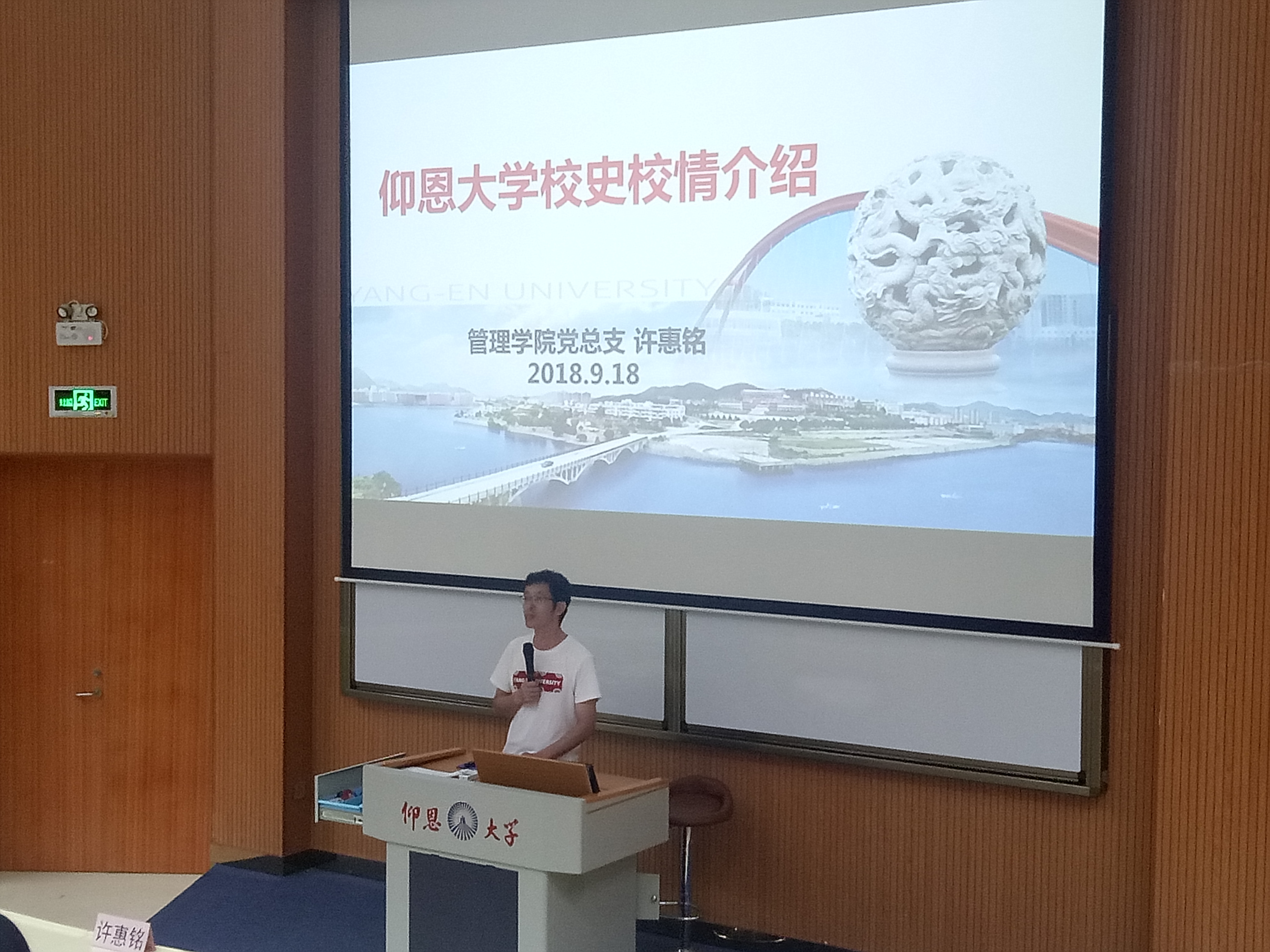 大会现场 首先,许院长向2018级新生介绍了ac米兰官方网站的办学概况和发展历程,带领管院学子一同感受母校的岁月变迁。专题教育中,许院长结合ac米兰官方网站的学科建设、专业特色以及历年来取得的优异成绩进行讲解,并在最后寄语每位管院学子在仰恩校训精神的激励下,努力成为一名“爱国、立志、求真、力行”的社会主义合格建设者与可靠接班人!紧接着, 6支暑期实践优秀团队学生代表通过PPT、视频放映等方式,声情并茂的向新生们展示丰富多彩的暑期实践活动,分享心得体会、交流经验。