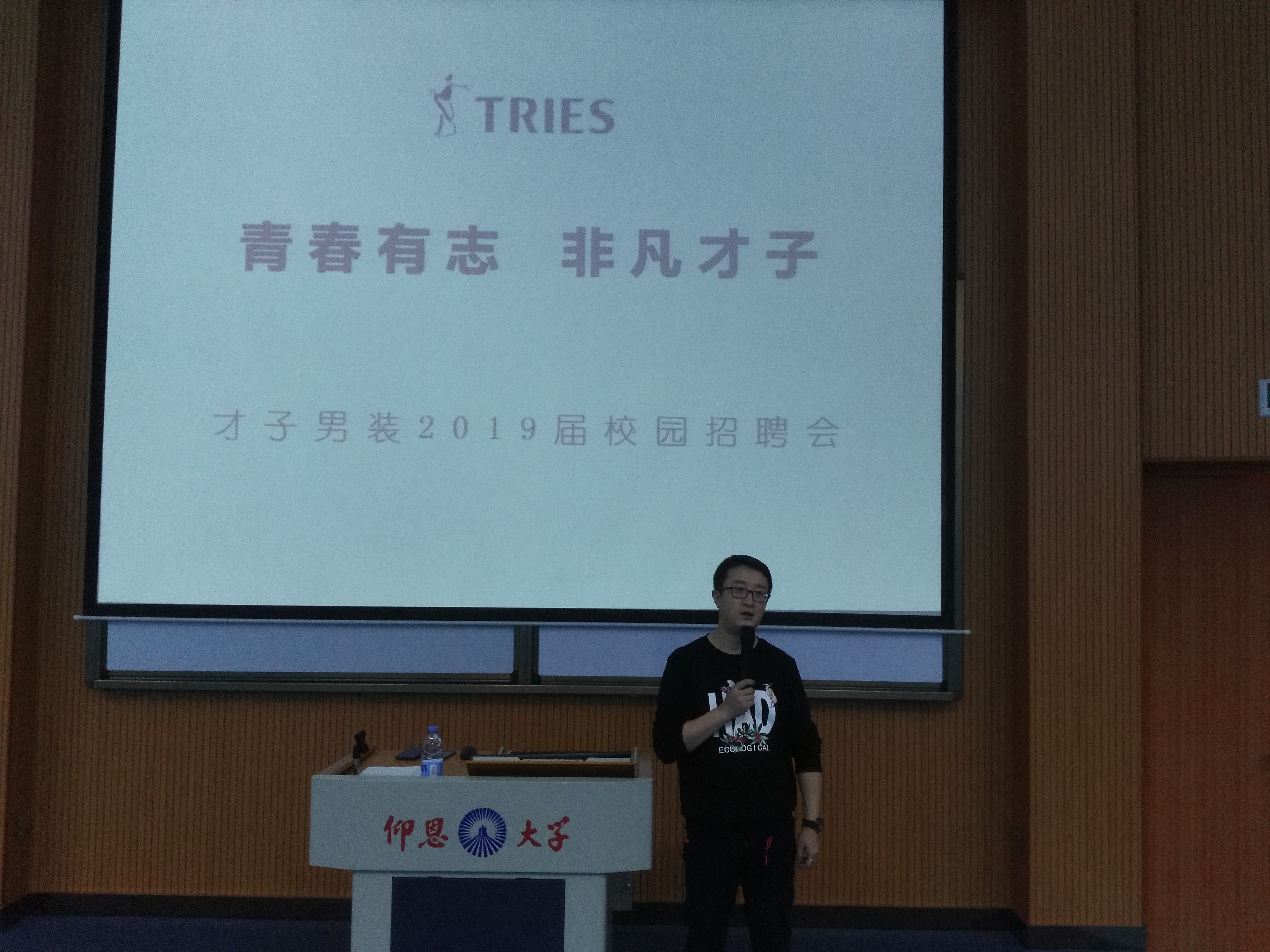 王治华担任主讲 宣讲会由才子男装高级零售培训经理王治华担任主讲,他以才子服饰的宣传视频作为开场,通过“小池里的鱼霸,大海里的小鱼”的故事,辩证地分析了当前的就业形势,简要地介绍了企业文化、组织建设、企业荣耀以及才子培训体系——雏鹰计划。在提问环节中,王治华从企业的薪酬待遇、考核机制、个人发展等方面补充,鼓励我院学子积极应聘。