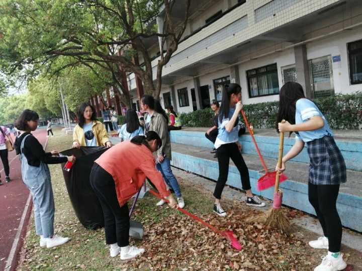 打扫校园 下午三点,在组织和安排下,同学们先后在共和楼清洁校内垃圾桶、清理卫生死角、捡拾垃圾,美化绿化校园。此外,同学们还为校内的环卫工人送水并与他们亲切交谈,询问他们的工作和生活情况。