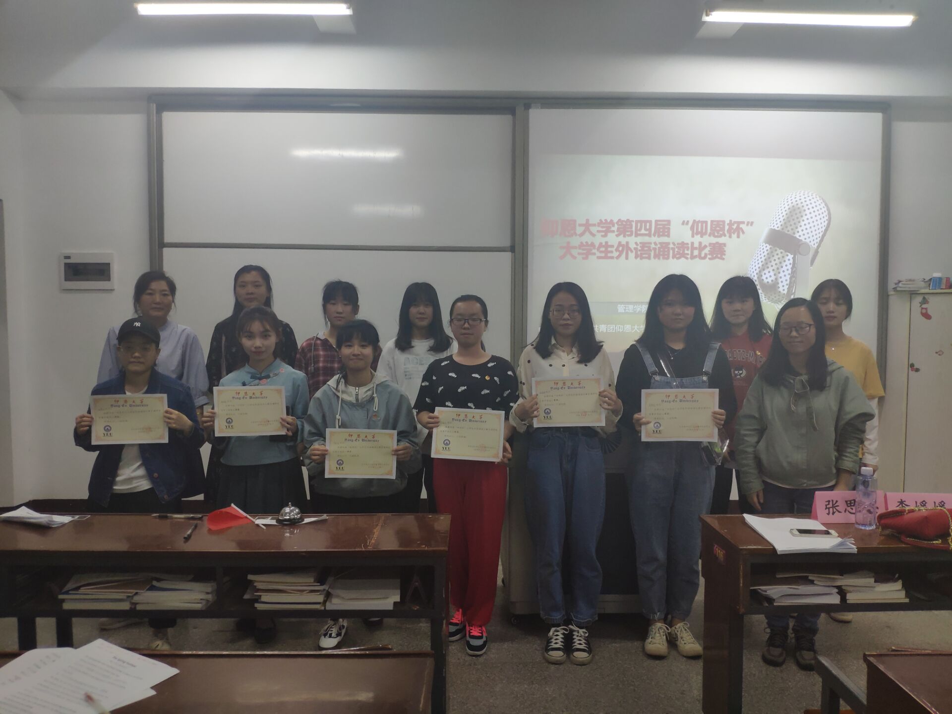 4月18日晚,第四届“仰恩杯”大学生外语诵读比赛ac米兰官方网站复赛在第一教学区共和楼323举行。复赛由我院团委主办,各系团总支协办,本次比赛邀请了外国语学院的张思思老师和李媛媛老师担任评委。