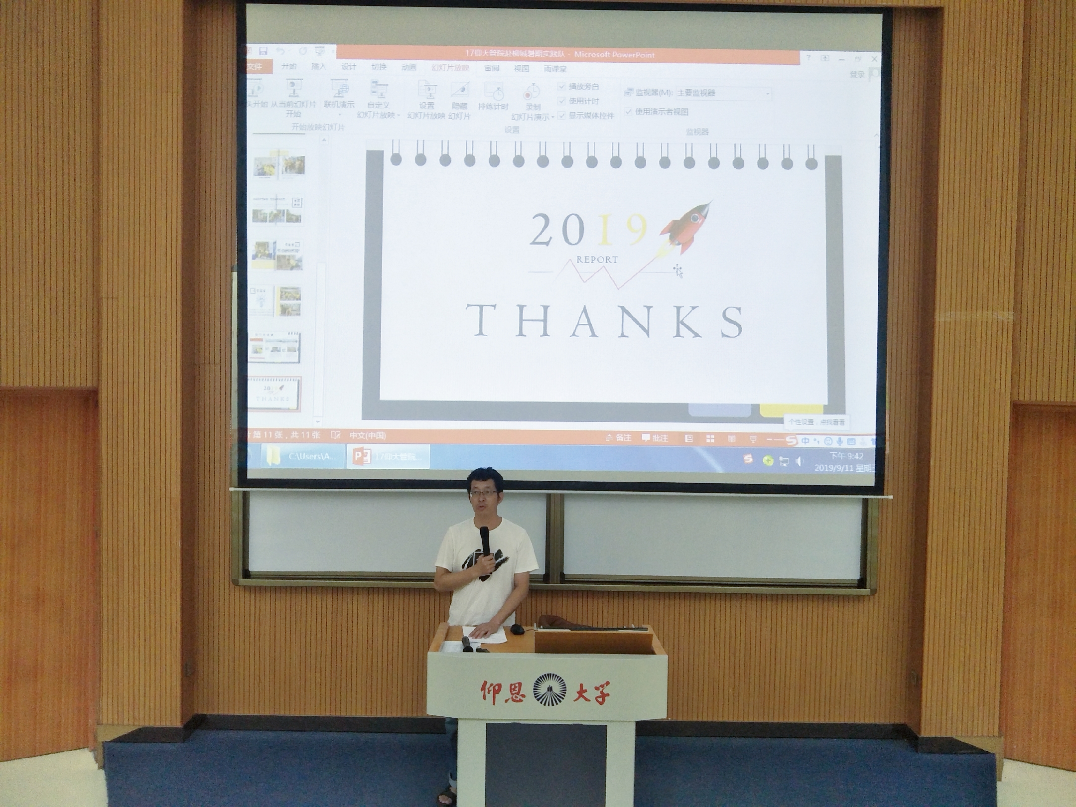 报告会现场 本次汇报共有10支专业实践队和10支社会实践队。每支实践队都进行了精彩的汇报,一张张生动鲜活的实践照片,展现出我院青年学子的责任担当;一句句厚重质朴的实践感言,反映了我院青年学子的成长蜕变。期间,由于电脑设备出现问题,在主持人的带领下在场师生齐唱《我和我的祖国》,献礼新中国成立70周年,把现场的气氛推向高潮。