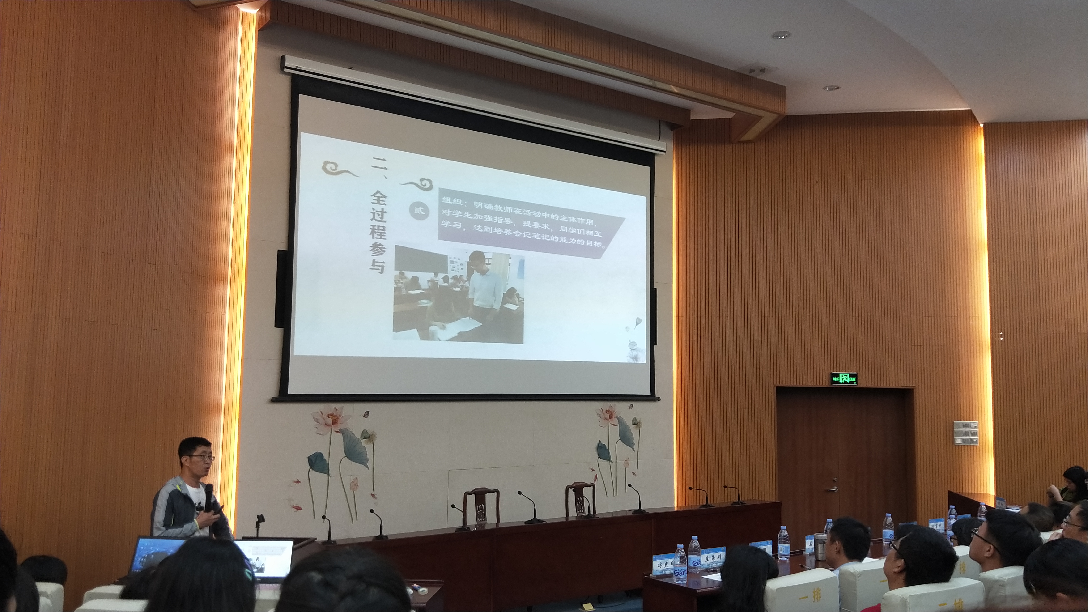 许惠铭分享赛事组织经验 经过班级初赛、学院复赛,我院共有7本笔记顺利闯入学校决赛。据悉,全校从各院系总共遴选了34本笔记参加决赛。评委们根据笔记的布局整洁性、逻辑条理性、内容总结性、笔记方法及实用性四个方面对入围决赛的笔记进行评分。在决赛现场,参赛选手们轮番上场,以PPT展示他们优秀而精美的笔记,分享了做课堂笔记的技巧、课程内容的学习收获和针对该门课程的建议。一篇篇工整的课程章节笔记,一个个彩色记号凸显的重点、一幅幅清晰的思维导图,展现了同学们扎实的学习作风和奋笔疾书的学习劲头。