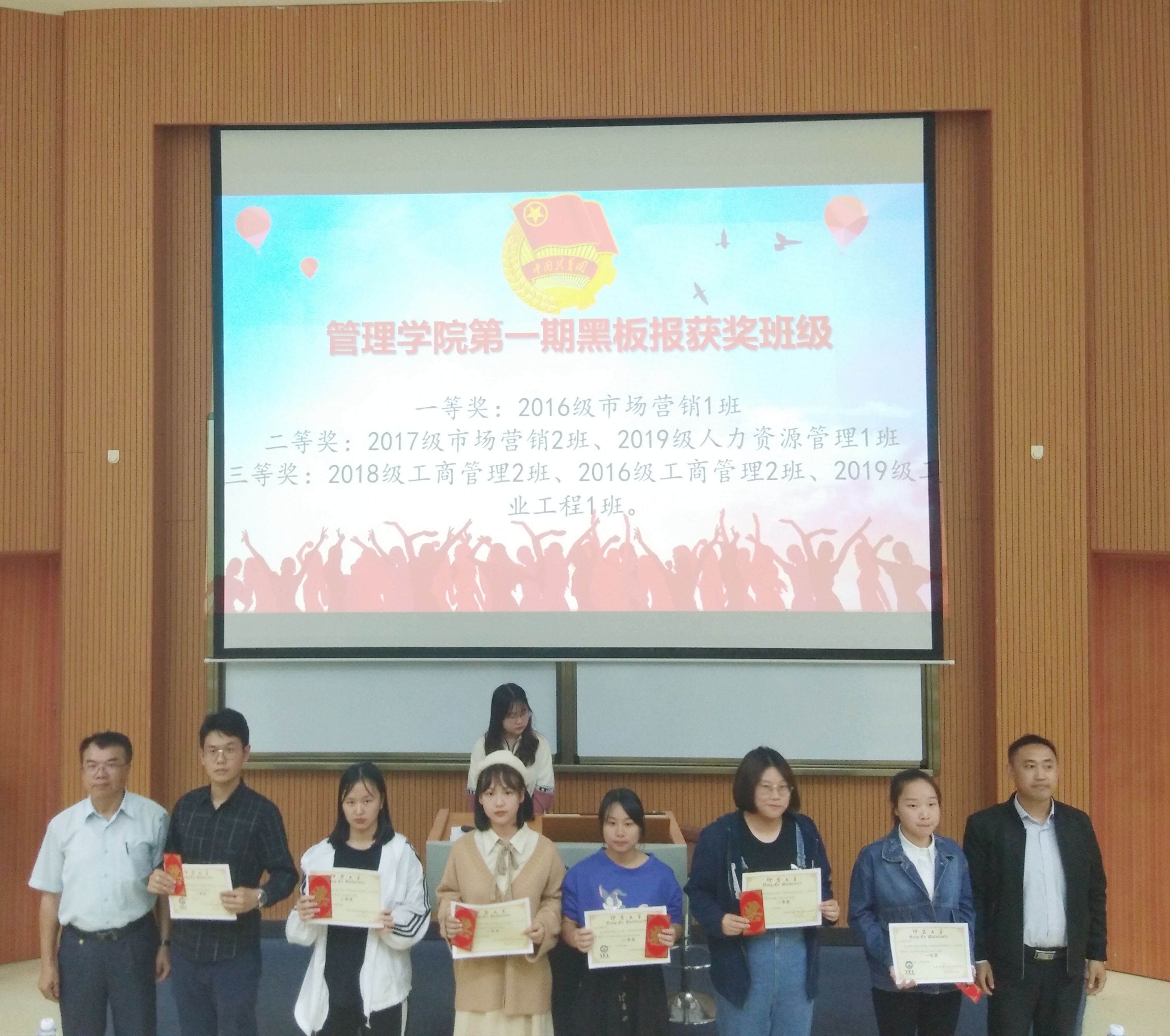 为黑板报优秀班级颁奖 院团委书记杜结实宣读了2019年暑期实践活动优秀团队和先进个人的表彰名单。院领导和各系团总支书记分别为获表彰的集体和个人颁奖。随后,对在ac米兰官方网站第一届课堂笔记大赛学院复赛和2019-2020学年第一期班级黑板报——庆祝新中国成立70周年专题评比中表现突出的集体和个人同时进行颁奖。