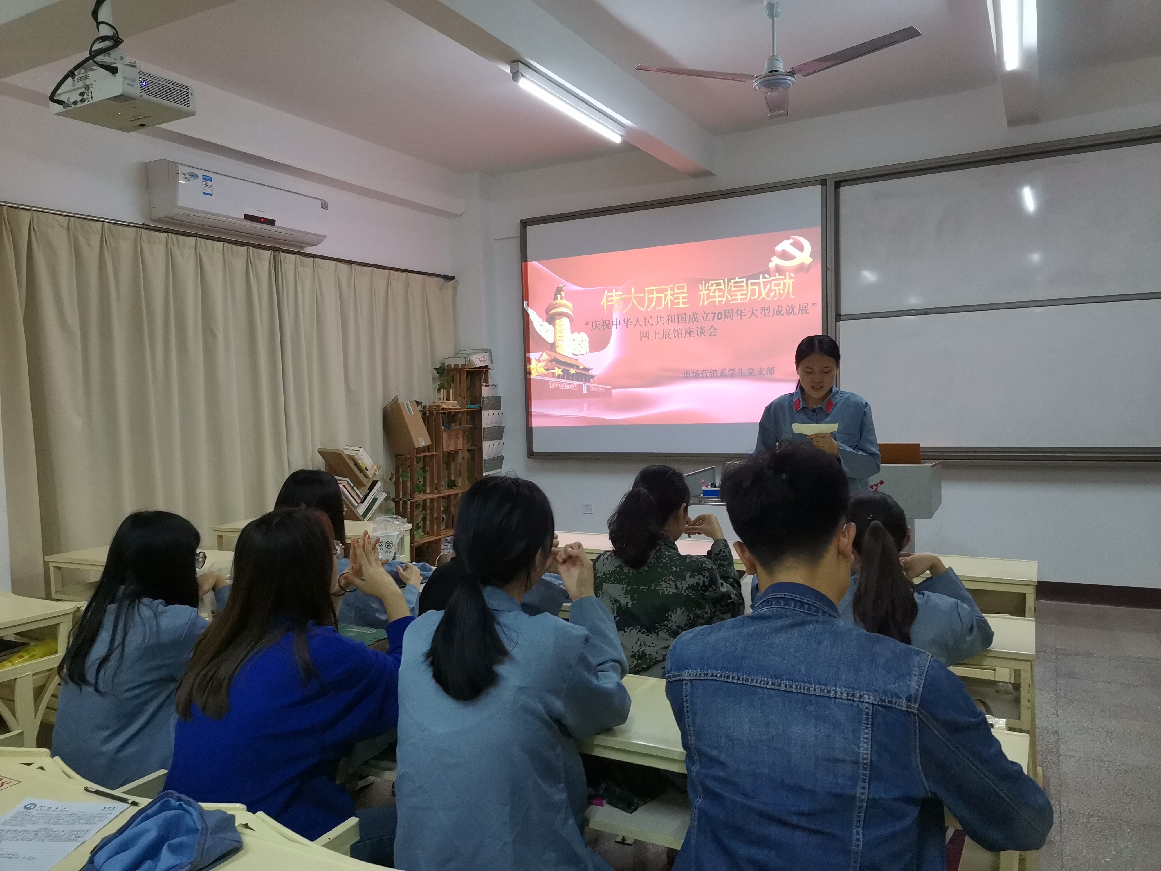 11月14日晚,市场营销系学生党支部于吉龙楼304开展了“庆祝中华人民共和国成立70周年大型成就展”网上展馆座谈会。参加本次活动的有支部全体党员,活动由林锦怡同志主持。