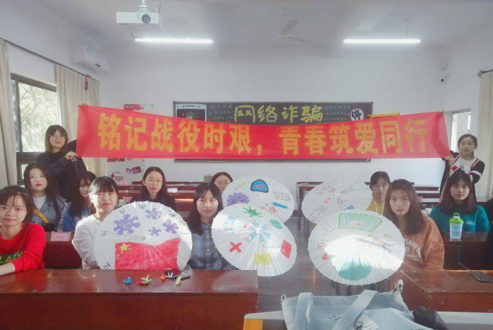 油纸伞创作合影 团员们通过此活动在油纸伞上绘制新型冠状病毒的模样,祈愿病毒远遁。油纸伞上国旗与抗疫的逆行者表示着对国家强大与逆行者英勇的赞美,歌颂着疫情期间人民群众的团结一心,众志成城。此次活动唤醒了当代青年人的文化传承意识,同时增强了团员们的文化自信和制度自信。