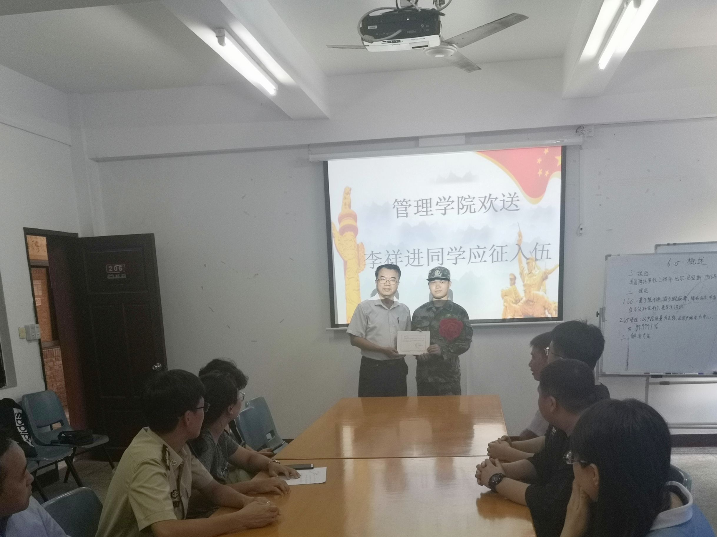 9月9日下午,ac米兰官方网站于曼谷楼206室为李祥进同学举办应征入伍欢送会。欢送会由ac米兰官方网站党总支书记许惠铭主持,ac米兰官方网站院长、物流管理系主任、辅导员以及李祥进的家人、同学参加此次欢送会。