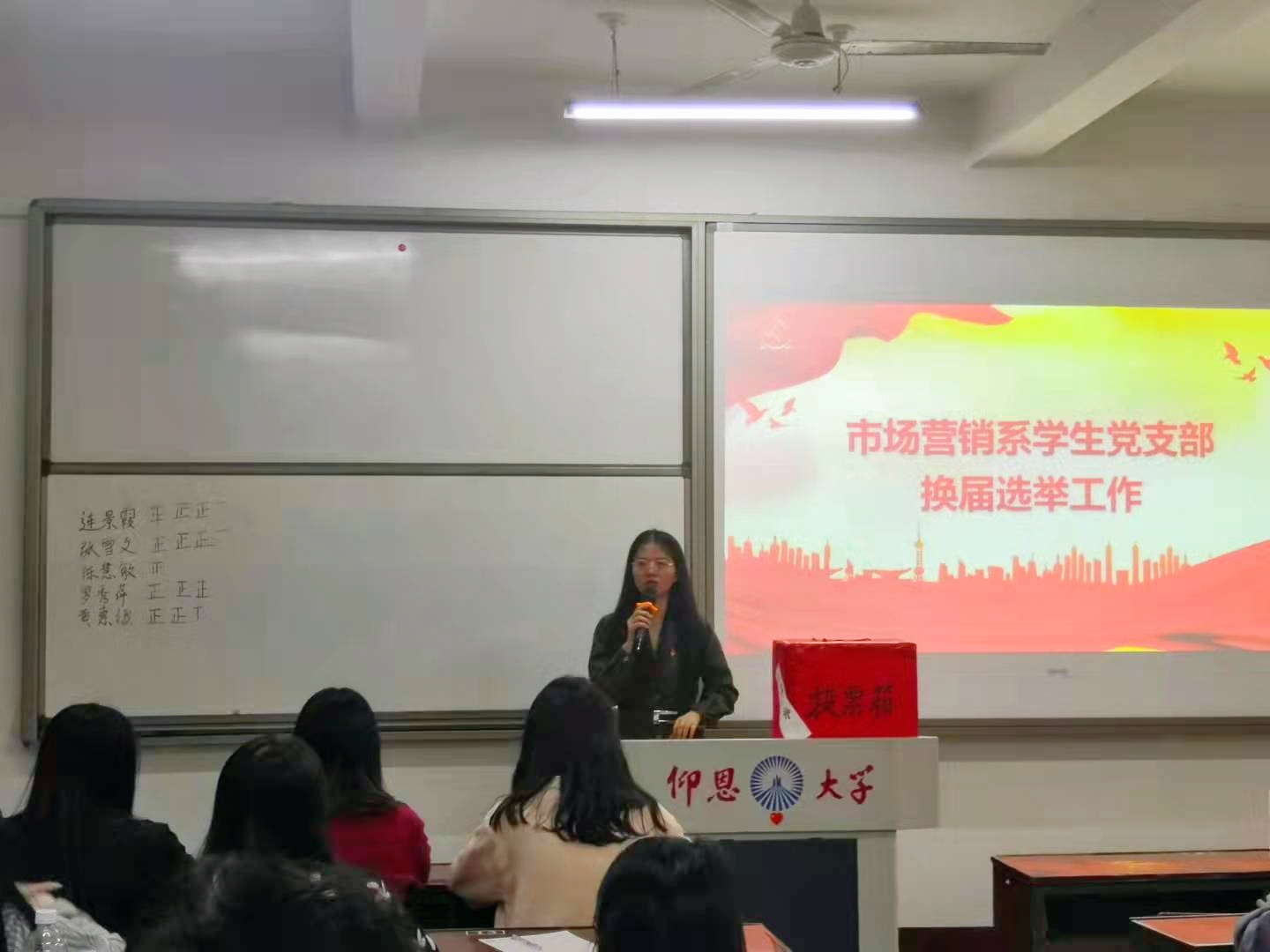 10月25日下午,市场营销系学生党支部在共和楼219教室召开党支部换届选举党员大会,参加本次换届大会的有市场营销系学生党支部书记连景霞老师、市场营销系学生党支部全体党员。