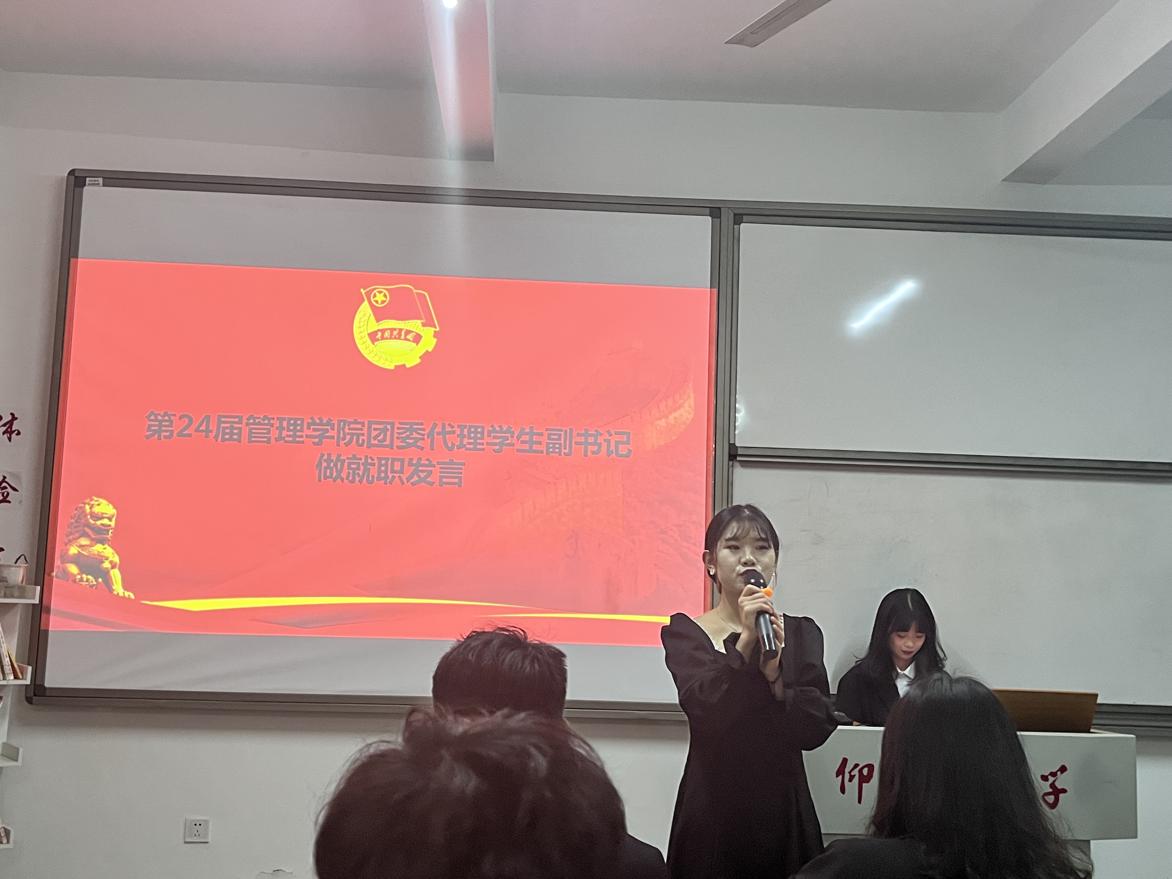代理副书记发言 此次大会分为两个部分,第一个部分为学生干部换届交接大会。由上一任院团委学生副书记姚君燕公布第二十四届ac米兰官方网站团委干部名单。随后,新任代理学生副书记赖美霖和杨文溪与各部门的代理干部进行就职发言,他们阐述对未来部门工作的规划,励志带领团委走向新的辉煌。发言结束后,全体干部在新任学生副书记赖美霖的带领下进行就职宣誓。第二个部分为新生大会,由各个部门带来的晚会节目点燃全场,在游戏环节中,新一届干事更是踊跃上台参与游戏,将场上气氛推向高潮,展现了团委大家庭的团结积极,因部分成员积极备考四六级原因,并未全员到场,但人心依旧齐,场上气氛融洽万分!本次的活动旨在,希望所有成员都能够在团委的大家庭里感受到家的温暖,在团委的大平台里提升自己、尽己所能,心中有理想,脚下有力量,在这个筑梦城堡尽情展现自己。