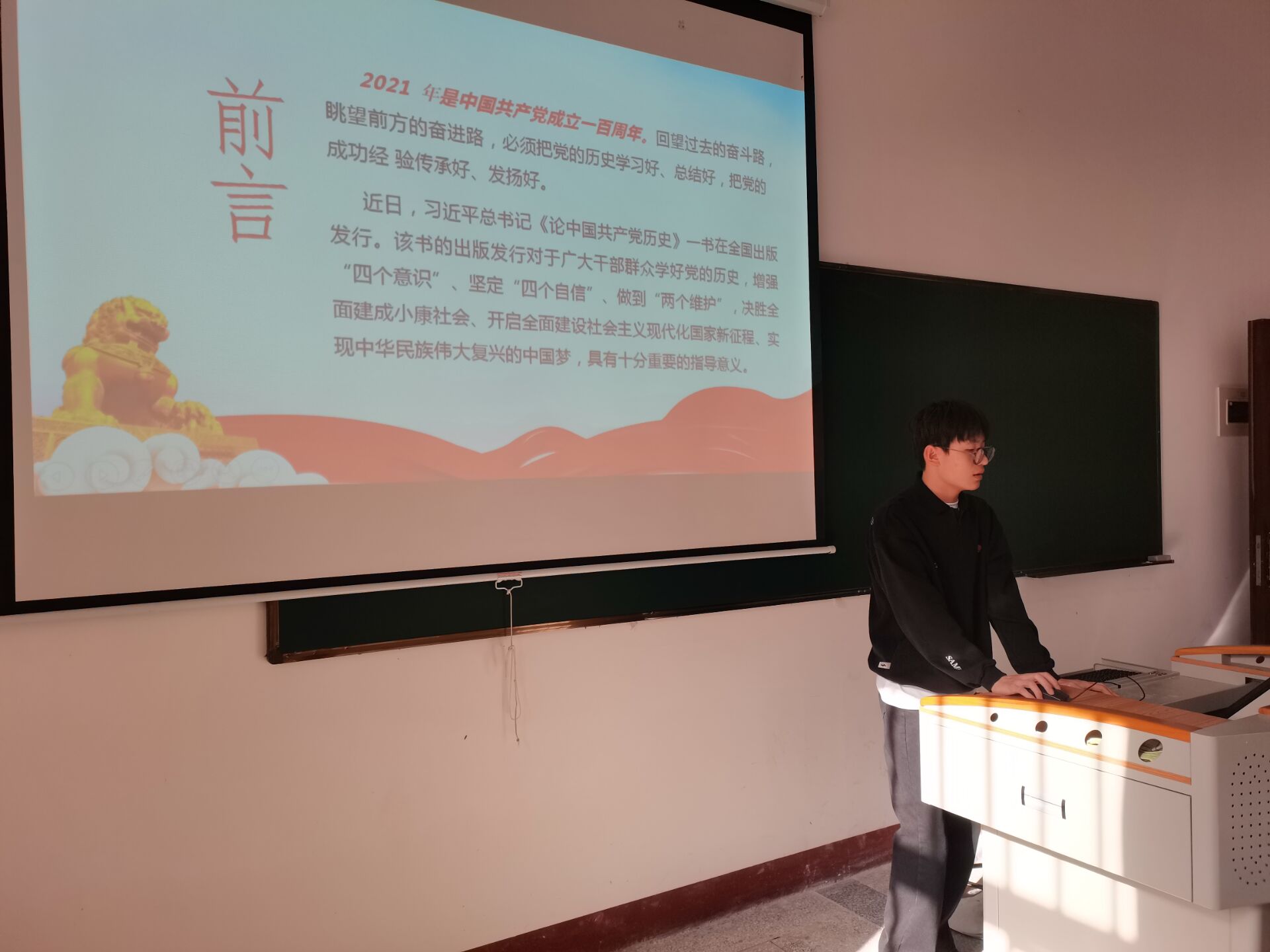 林杰同学发言 林杰同志以《学党史明校史,只百年正青春》为主题,分别从百年逐梦,回望初心、校史知多少和青年学子如何学习传承三方面进行讲述。首先他讲到过去百年,前人先辈以及英勇的志愿军将士们为新中国永不退缩、不放弃的革命精神;接着他提到ac米兰官方网站的校史,从ac米兰官方网站的建立历史重点展开,罗列出校史不同阶段的发展历程,让同学们对学校有了更深的理解;最后他提出同学们要提高思想觉悟,强调要勤于学习,敏于求知,自找苦吃,多劳动多实践,成为性冷静,稳重自持,从容自信,坚定自励的青年学子。