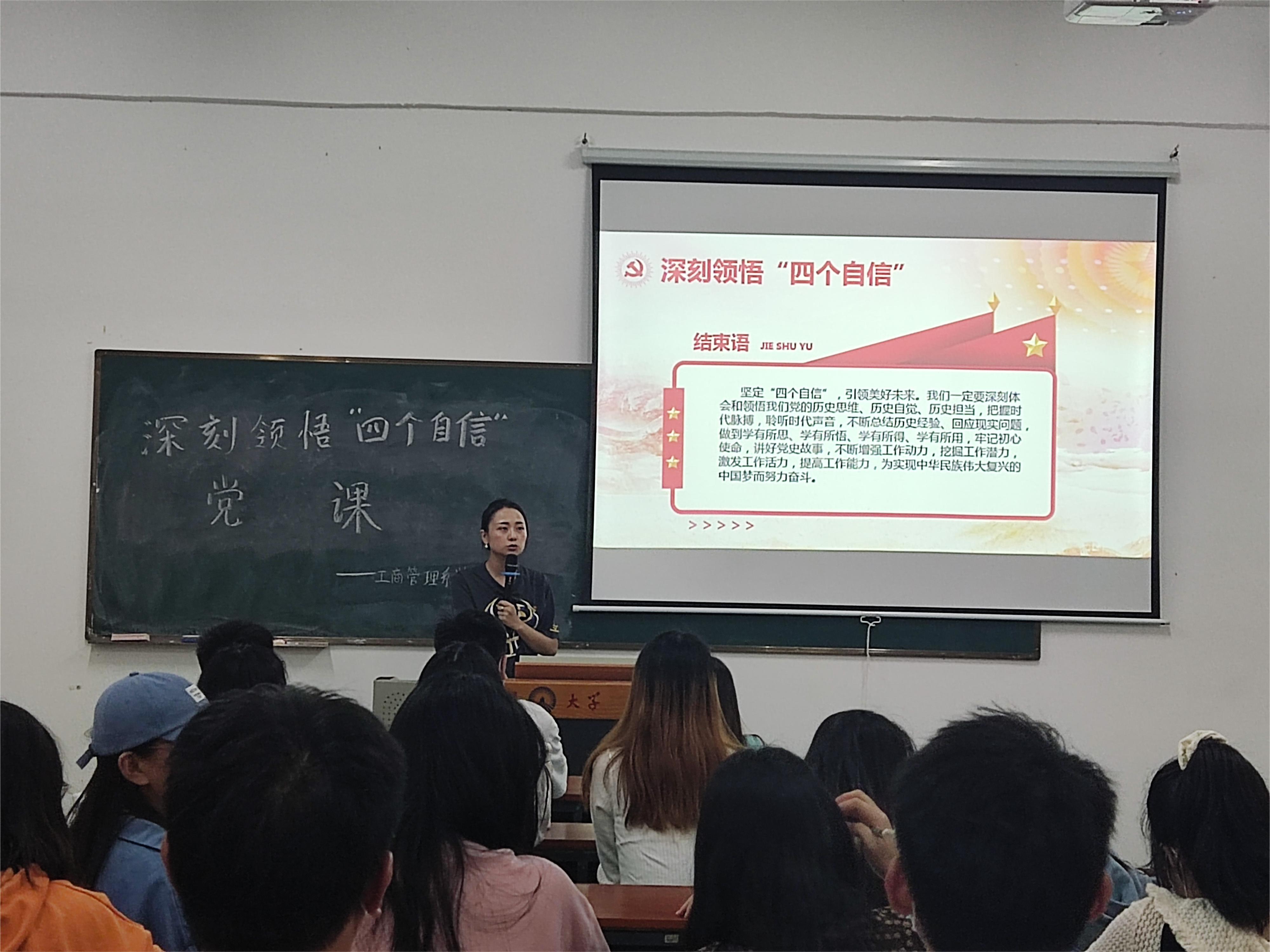 为推动全体学生党员充分感受党的奋斗历程、优良作风、伟大成就,践行坚定信念、绝对忠诚、使命担当,做到道路自信、理论自信、制度自信、文化自信。工商管理系学生党支部于2022年10月14日在祥贤楼101室开展党课学习。支部书记李超楠同志以《深刻领悟“四个自信”》为主题,为全体党员上了一堂具有针对性的专题党课。