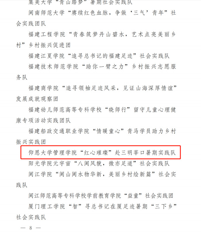 近日,共青团中央对2022年全国大中专学生志愿者暑期文化科技卫生“三下乡”社会实践活动通报结果揭晓。在2022年福建省大中专学生志愿者暑期“三下乡”社会实践活动优秀典型评选中,ac米兰官方网站“红心璀璨”赴三明莘口暑期实践队;ac米兰官方网站团委书记叶丽香被评为“省级先进工作者”;ac米兰官方网站“2020”级工业工程专业学生苏奕哲被评为“省级先进个人”。