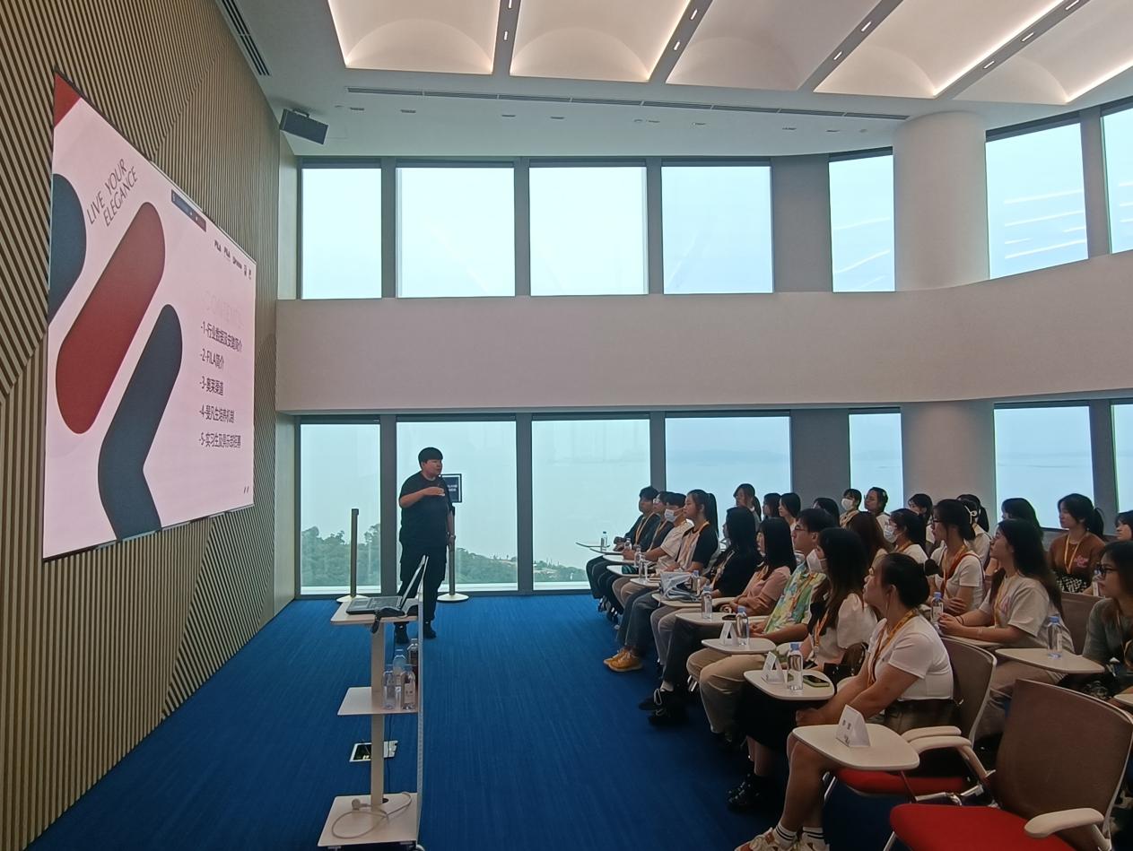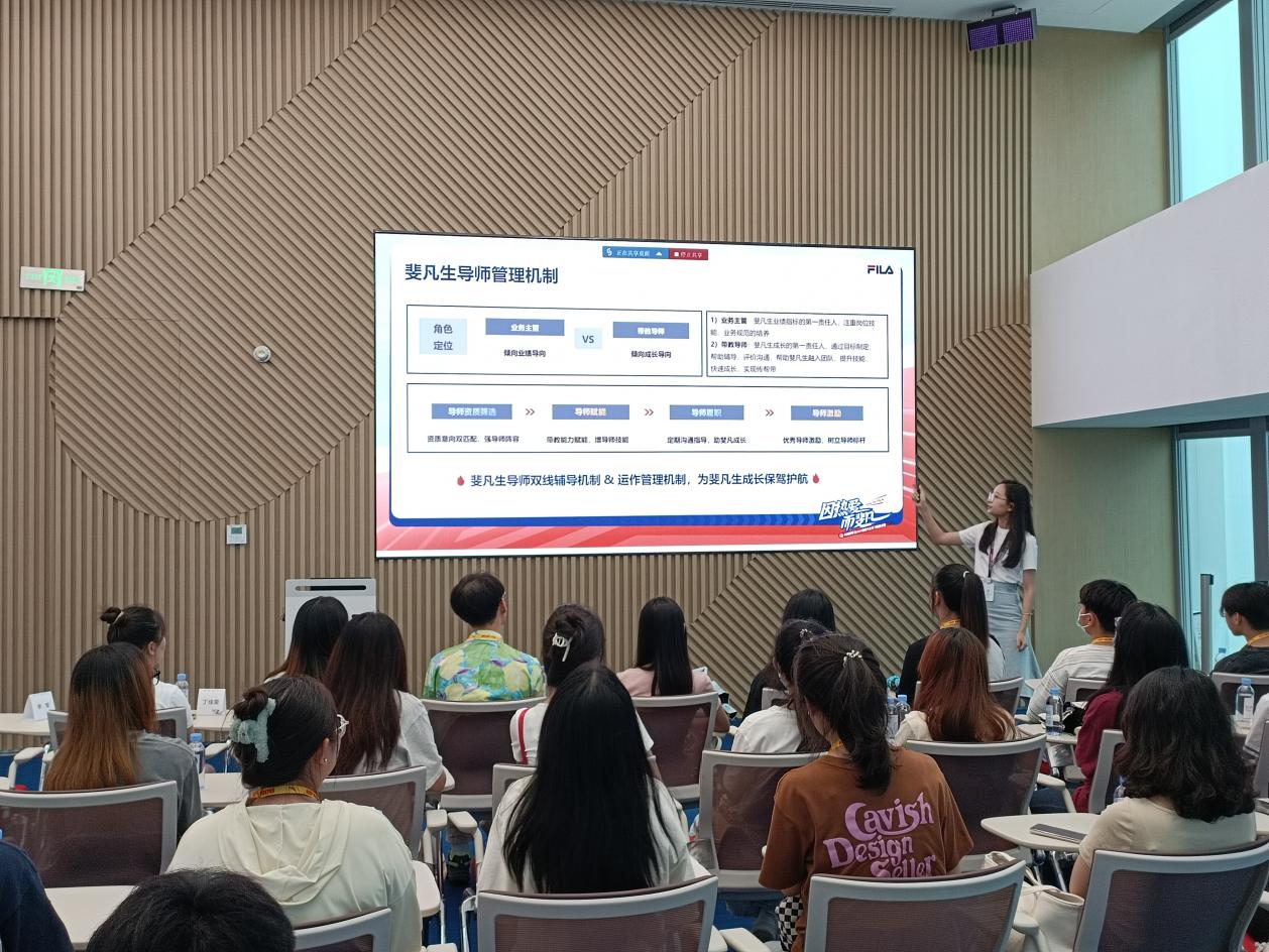 参观结束后,斐乐奥莱零售部副总监李莹向同学们详细介绍了斐乐品牌发展历程、未来市场前景以及如何从8年时间里达到1亿到百亿突破,目前向300亿大关奋进的真实案例。同时,李总分享了个人的职业规划与成长,提出“赛道”、“选择”、“目标”三个关键词,让同学们汲取到很多职场“干货”。斐乐人力经理林俐恋就公司的斐凡生成长规划、导师管理机制向同学们作了详细介绍,从定岗到经理的完善晋升机制,采用导师双线辅导机制和运作管理机制,一直在为管培生保驾护航。