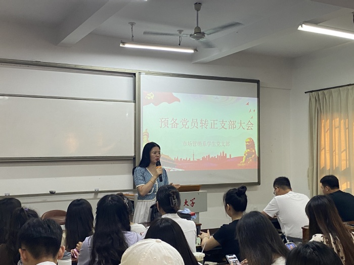 6月21日下午,市场营销学生党支部于共和楼219召开预备党员转正大会,本次大会由黄于诚同志主持,全体党员及预备党员群众代表参加本次会议。