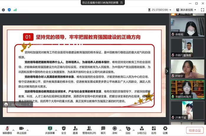 主讲人指出习近平总书记在中共中央政治局第五次集体学习时的重要讲话意义深远、系统论述、逻辑严密、指导性强。会议就“为什么建设教育强国”“建设什么样的教育强国”“如何建设教育强国”等问题作出了科学阐述、提出了明确要求、指明了前进方向。党员同志们纷纷表示,要认真学习、领会、宣传、贯彻习近平总书记系列重要讲话精神,要用习近平新时代中国特色社会主义思想武装头脑、指导实践,在后续学习和工作中,做到以史为鉴,奋发图强;以人为鉴,脚踏实地。