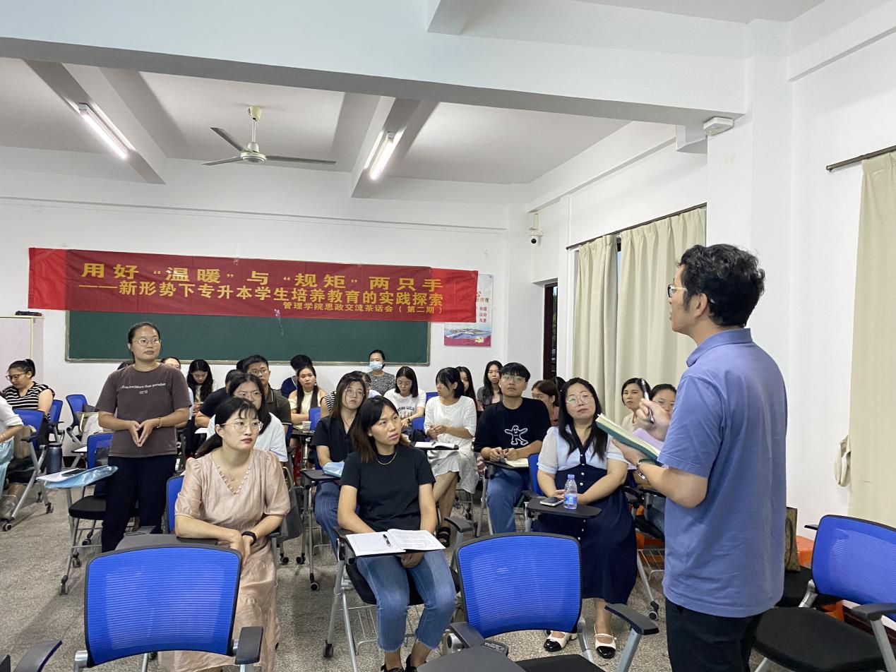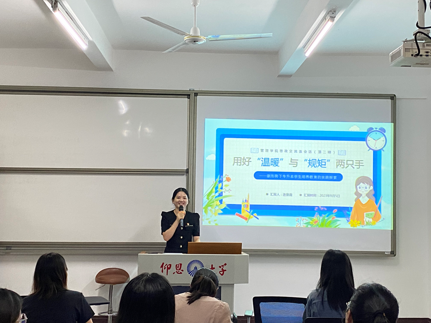 为进一步提高ac米兰官方网站专升本学生思政工作水平和质量,完善学院全员育人工作格局。9月11日下午,ac米兰官方网站在吉龙楼208举办第二期学院思政交流茶话会,聚焦学院专升本学生的思想政治教育工作。活动由党总支书记兼常务副院长许惠铭主持,辅导员连景霞、班主任许勇分别进行主题分享,全院班主任、辅导员老师参加活动。