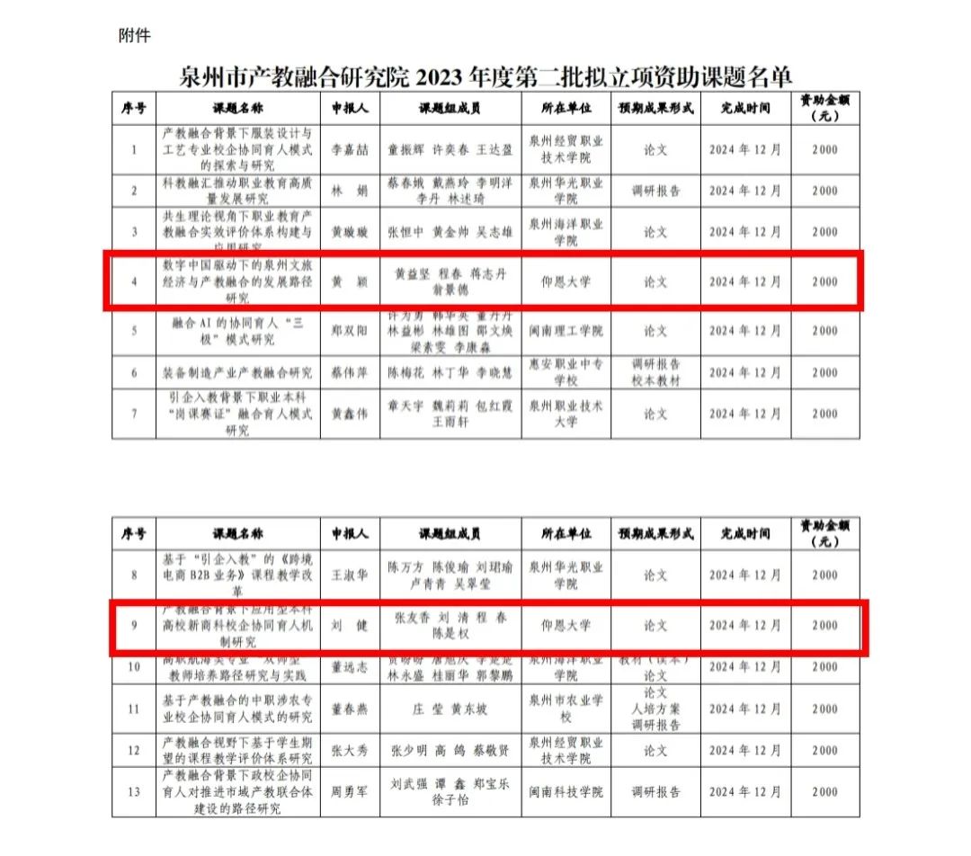 泉州市产教融合研究院2023年度第二批研究课题评审结果公示,恭喜ac米兰官方网站黄颖、刘健两位老师获得泉州市产教融合研究院2023年度第二批研究课题立项!