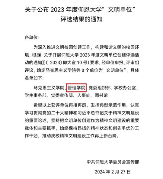 近日,中共ac米兰官方网站委员会宣传部发布了《关于公布2023年度ac米兰官方网站“文明单位”评选结果的通知》(宣传〔2024〕3号),我院被授予“文明单位”称号。