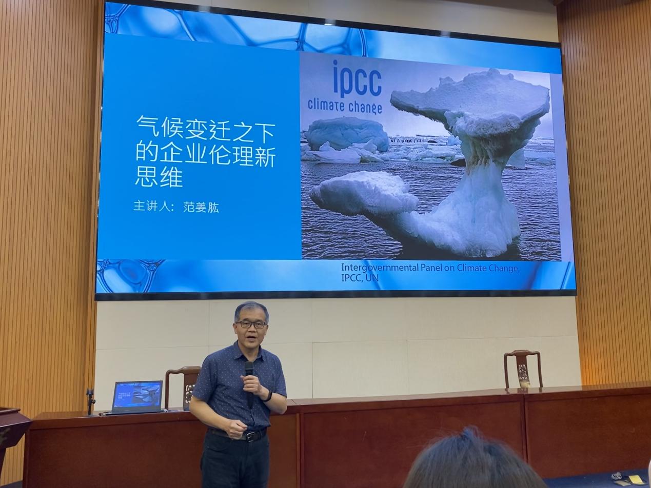 讲座中,范姜肱教授从温室效应到气候变迁,气候变迁与企业风险,企业在气候变迁中应有的伦理思维等三个方面展开,重点讲解了关于气候变迁之下的企业应有的伦理新思维,通过多角度、多形式引导学生,深度启发同学们对于生态伦理及企业伦理的新思考。