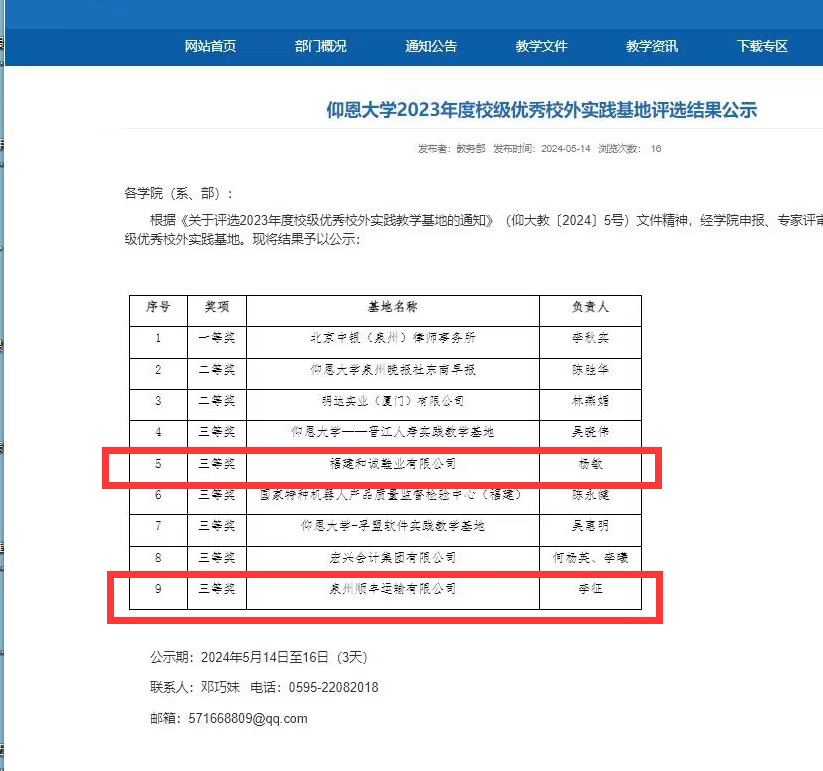近日,根据《关于评选2023年度校级优秀校外实践教学基地的通知》(仰大教〔2024〕5号),ac米兰官方网站2023年度校级优秀校外实践基地评选结果公示,我院工业工程系主任杨敏所负责的校外实践基地“福建和诚鞋业有限公司”和物流管理系主任李征所负责的校外实践基地“泉州顺丰运输有限公司”均荣获三等奖。