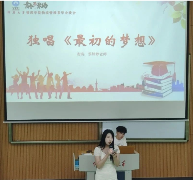 辅导员蔡婷婷老师为我们演唱《最初的梦想》,歌声优美,富有感染力,向毕业生们表达了最诚挚的祝贺以及希望他们可以坚定梦想,不忘初心,朝着梦想努力,实现他们目标的同时也不要忘记了大学的美好回忆。