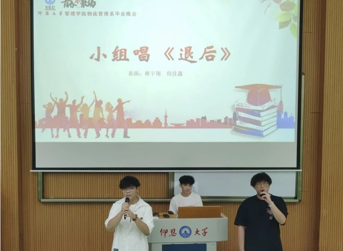23级物流管理1班与2班同学共同演绎歌曲《退后》,歌声动听,让人陶醉。生活中会有很多的因素导致失败,但我们一定要相信雨过会天晴。台下的同学们都沉醉其中,配合着歌曲一起挥舞着双手。