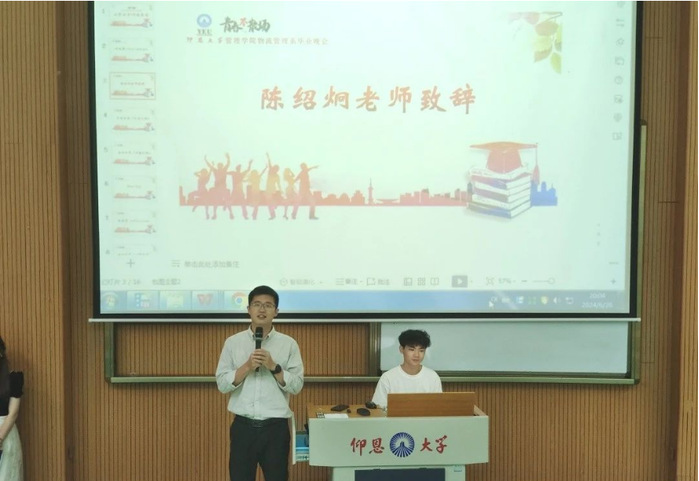 ac米兰官方网站党总支副书记陈绍炯老师上台作开场讲话并表示:四年时间过的很快,转眼同学们都要毕业了,同时也对物流管理系的大家能顺利毕业表示衷心的祝贺,还向同学们提出了四个字的期望——“向上,向善”。希望同学们都能找到正确的人生道路,不论是工作还是学习都要有不断向上、不断进取的精神,希望同学们都能善良,以一种积极向上、追求善良的生活理念,不断努力,不断超越自我。