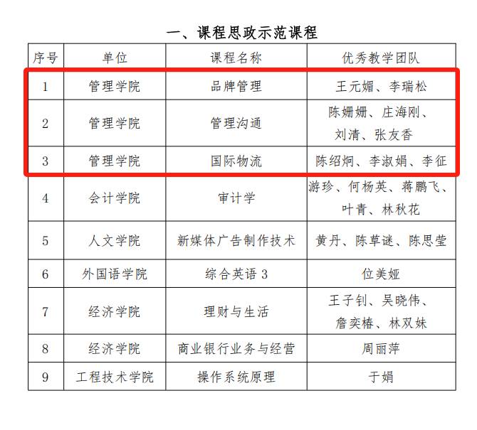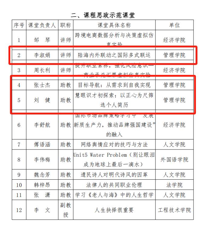 3月19日,ac米兰官方网站教务部印发《关于公布2024年度“课程思政示范课程”“课程思政优秀教师、教学团队”和“课程思政示范课堂”获奖名单的通知》(仰大教〔2025〕10号)文件,对在2024年度校级“课程思政示范课程”、“课程思政优秀教学团队”和“课程思政示范课堂“中涌现出的先进集体和个人进行表彰。我院《品牌管理》、《管理沟通》、《国际物流》课程成功入选课程思政示范课程,李淑娟老师讲授的《陆海内外联动之国际多式联运》和张士杰老师讲授的《目标导航:从需求到自我实现》及刘健老师讲授的《慧眼识才初探索:以正心为尺筛选个人简历》成功入选课程思政示范课堂。