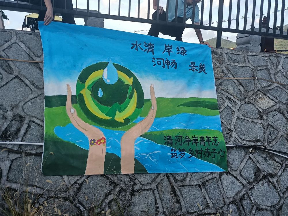【实践】实践队员把画布挂在河长制主题公园的墙上