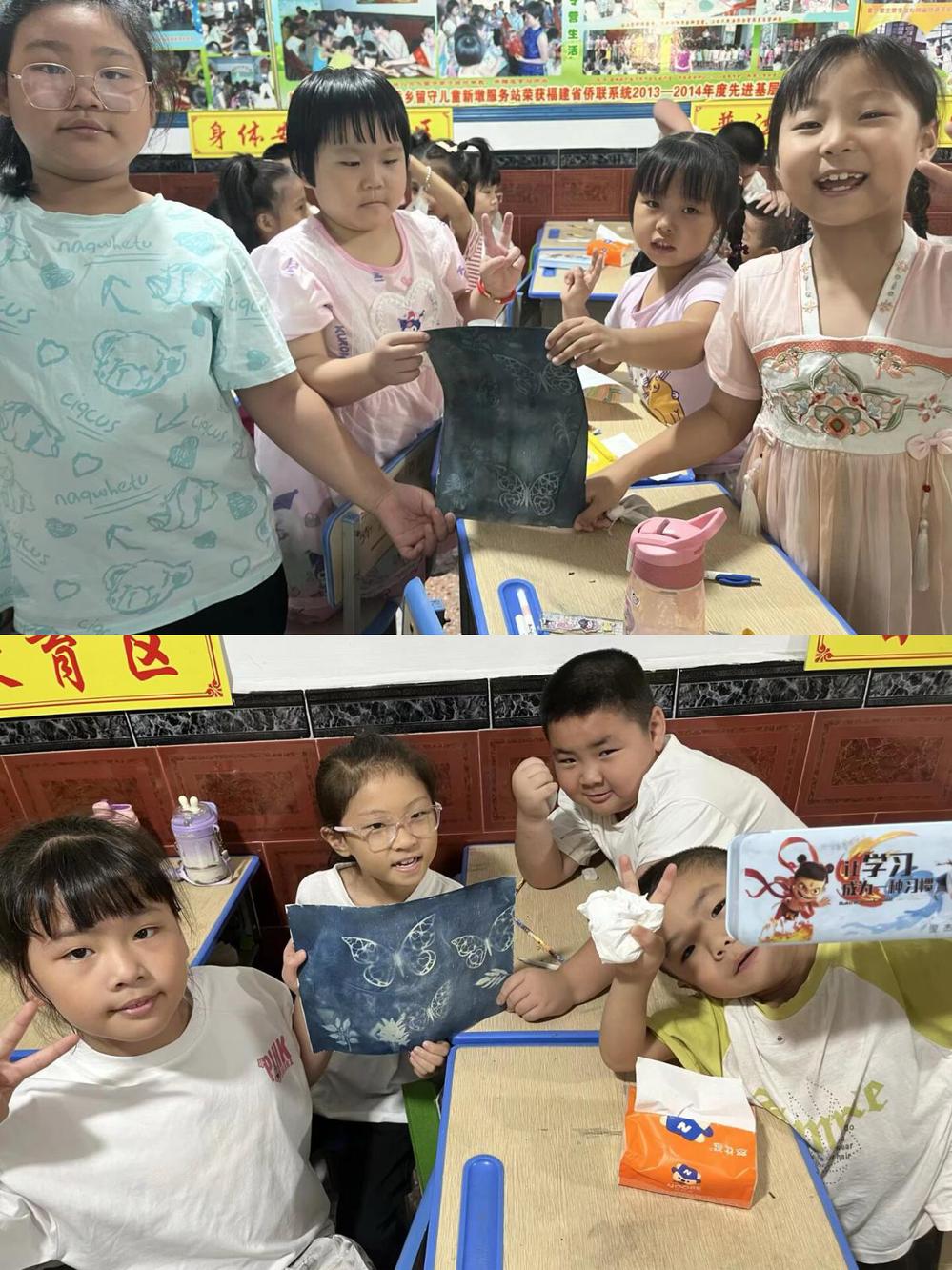 实践队员余志伟指导孩子们将印有词语的纸张进行裁剪和拼贴,完成诗歌创作。实践队员薛郑佳曼讲解“不织布手工”课程。孩子们使用老师提供的材料,在不织布上裁剪图案并完成拼贴作品,这有助于孩子们提高手部操作能力和注意力集中度。古法蓝晒课程中,孩子们跟着老师在涂有感光溶液的纸张上放置自然素材,经阳光照射后形成影像。这一过程展示了古典摄影技术的基本原理。