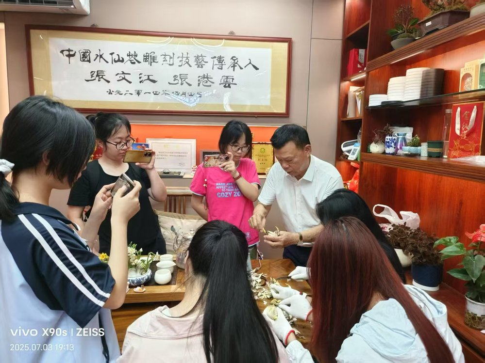 在技艺馆中,实践队成员亲自上手体验水仙花雕刻的乐趣,感受非遗魅力,体会到这门技艺的独特之处,并采访了水仙花雕刻技艺的传承人漳州市水仙花协会会长、第五代传承人张文江。