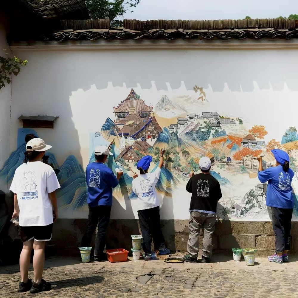 实践队员们充分发挥创意与专业优势,在后溪村的建筑外墙上精心绘制了一幅幅精美的文化墙绘。这些墙绘融合了传统建筑与自然风光元素,色彩鲜艳,形象生动,成为了村里一道独特的风景线。传统民俗场景在笔下栩栩如生,展现了后溪村丰富的文化内涵,自然风光图景则让人仿佛置身于山水之间,感受着乡村的宁静与美丽。