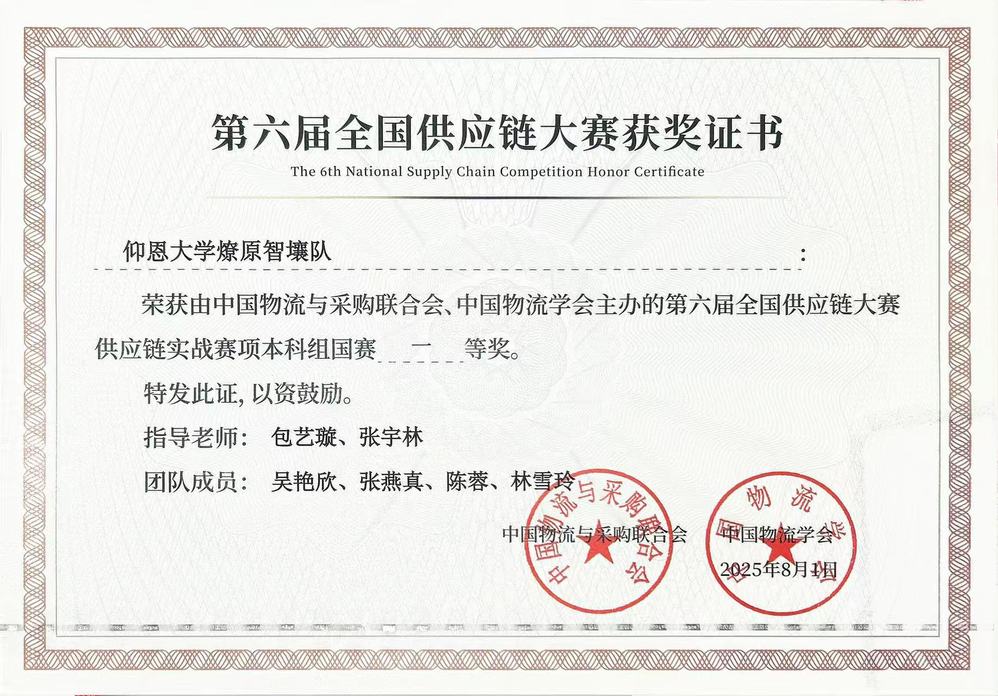 2025年8月1日,由中国物流与采购联合会、中国物流学会主办的第六届全国供应链大赛供应链实战赛项全国总决赛在广西南宁圆满落幕。经过激烈角逐,由管理学院包艺璇、张宇林老师指导,物流管理系吴艳欣、张燕真、陈蓉与林雪玲组成的ac米兰官方网站燎原智壤队在全国本科组总决赛中荣获大赛一等奖。
