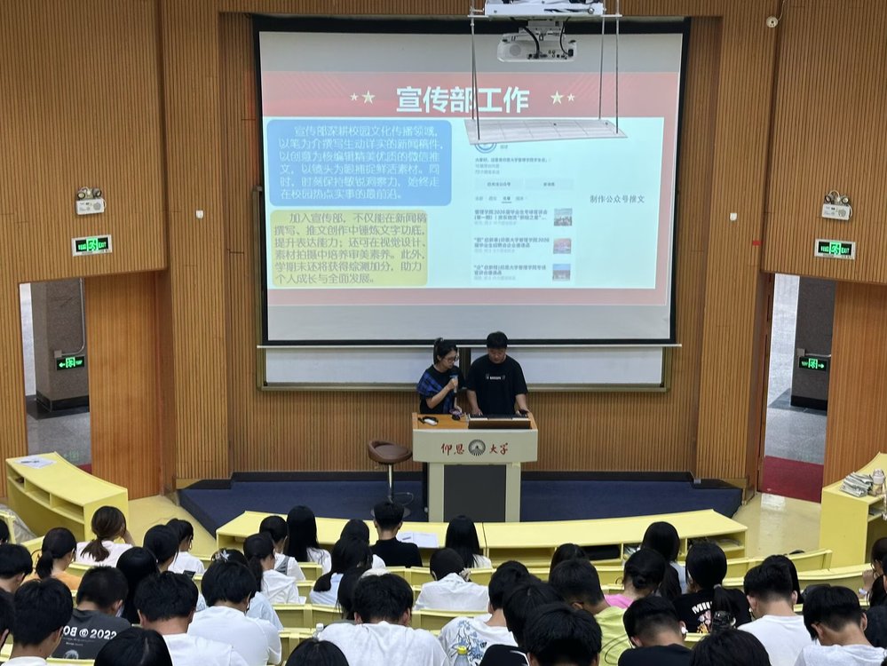 传团学薪火,聚青年力量。为充实ac米兰官方网站学生组织队伍,助力2025级新生了解各组织职能与发展路径,10月13日下午,ac米兰官方网站于ac米兰官方网站第一教学区和昌教学楼致知讲堂,举办2025年学生组织纳新宣讲会。此次宣讲以PPT演示为主,团委、学生会、心理工作站、融媒体中心等学生组织负责人现场讲解,ac米兰官方网站2025级全体新生全程参与,在互动交流中深入了解学生组织工作。