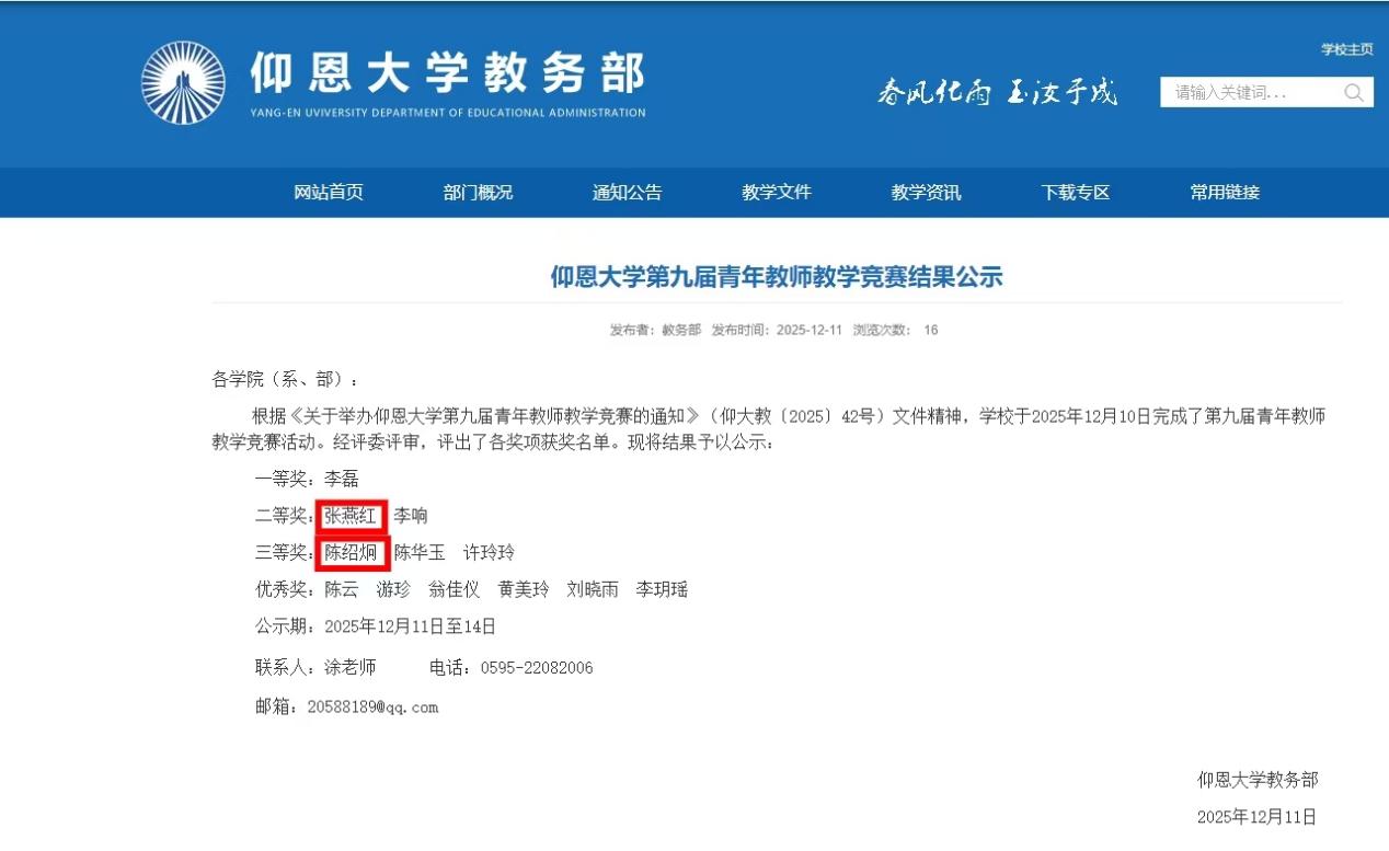ac米兰官方网站始终重视青年教师的培养工作,通过“老带新”帮扶、教学技能培训、教研活动交流等方式,助力青年教师快速成长。此次两位老师在竞赛中获奖,既是个人教学能力的体现,也是学院教学建设成果的生动缩影。下一步,学院将继续搭建青年教师发展平台,鼓励更多教师积极参与教学实践与创新,以更优质的教学质量赋能学生成长,为学校的教育教学事业贡献ac米兰官方网站的力量!