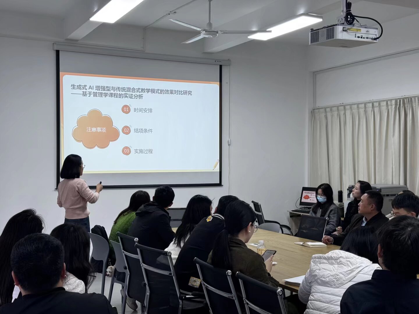 张迎华老师分享了近期参加"AI+教育教学辅助技能"学术会议的收获。她系统介绍了当前AI技术在教育教学与科研创新领域的前沿应用成果与发展趋势,分享了其他院校在AI+教学科研融合方面的先进实践案例,并对我院如何依托AI技术赋能教学科研提质增效提出了建设性思考,为与会教师带来了新的启发。